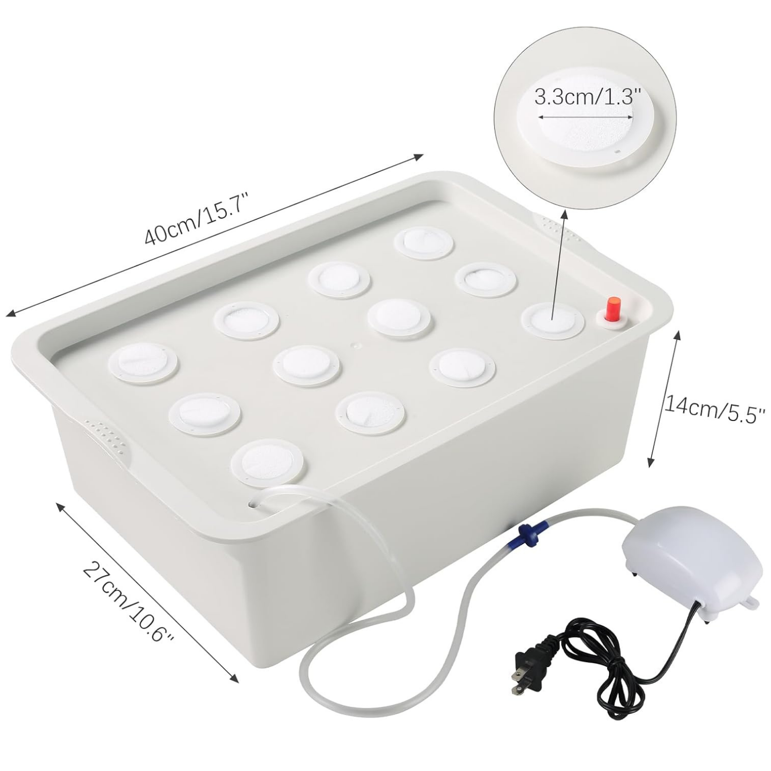 - 1 x Box; 1 x Buoy Deck; 1 x Buoy; 12 x Net Pot; 12 x Sponges; 1 x Air Pump; 1 x Bubble Stone; 1 x Check Valve;1 x Silicone Hose 3.9"+35.4"; 1 x Tweezers; 1 x English manual.